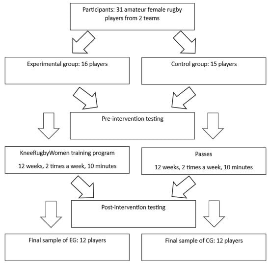 A group of 31 amateur female Rugby Union players from two clubs volunteered to participate in the study. The athletes had to be a minimum of 15 years old, free of serious knee injury in the 6 months before testing and actively participate in Czech amateur rugby competitions. The players were randomly allocated to a condition in a counterbalanced manner to either an experimental group (EG, n = 16) or a control group (CG, n = 15). Seven players were not present at pre- or post-intervention testing or did not participate in at least 80% of training sessions. According to the analysis, these players were missing at random (i.e., not significantly different from the remaining players in any variable measured) and therefore were not included in the final analysis. The final sample of 24 players was analyzed, 12 in the EG (mean ± SD: age, 20.05 ± 4.43 yrs., height, 166.54 ± 4.46 cm, body mass: 64.65 ± 6.44 kg) and 12 in the CG (mean ± SD: age, 20.04 ± 4.88 yrs., height: 166.83 ± 7.30 cm, body mass: 69.83 ± 12.84 kg). On average, the players trained 3 times a week, 90 min per session. The players were instructed not to participate in any vigorous activity 48 h prior to the testing.