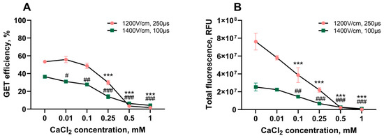 Dependence of pDNA electrotransfection efficiency (A) and total fluorescence intensity (B) on the strength of the applied electric field at different CaCl2 concentrations. Cells were treated using one square pulse of 1200 V/cm for 250 μs or 1400 V/cm for 100 μs. Results were evaluated 24 h after electroporation. Error bars represent the standard error of the mean (SEM) of n = 9 experimental replicates. In case standard errors were lower than actual data points, error bars are not visible. The statistical significance between the control (0 mM) and the 0.01, 0.1, 0.25, 0.5, and 1 mM CaCl2 concentrations is denoted by *** (1200 V/cm) and #, ##, and ### (1400V/cm). # represents p < 0.05, ##—p < 0.01, and *** or ### represents the p < 0.001.