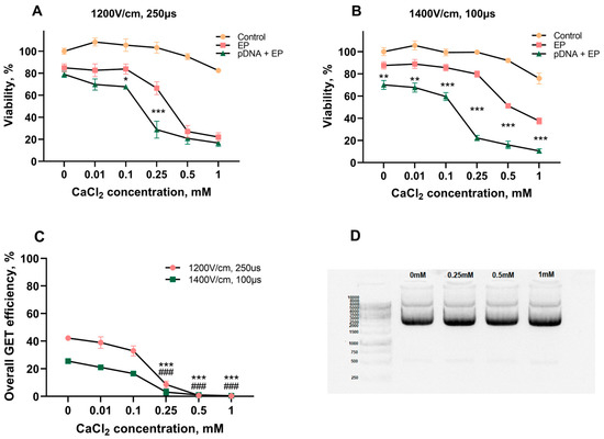 The effect of different CaCl2 concentrations on cell viability (A,B), overall GET (C), and pDNA electrophoretic mobility (D). For panels A, B, and C, cells were treated using one square pulse of 1200 V/cm for 250 μs or 1400 V/cm for 100 μs. Results were evaluated 24 h after electroporation. Error bars represent the standard error of the mean (SEM) of n = 9 experimental replicates. In case standard errors were lower than actual data points, error bars are not visible. The statistical differences between calcium electroporation alone (pink squares) and in combination with pDNA (green triangles) at different CaCl2 concentrations are denoted by *, **, and *** (Panels A and B). For panel C, the statistical significance between the control (0 mM) and the 0.1, 0.01, 0.25, 0.5, and 1 mM CaCl2 concentrations is denoted by *** (1200 V/cm) and ### (1400 V/cm). * represents the p < 0.005, **—p < 0.01 and *** or ### represents p < 0.001. For panel D, pDNA was electroporated using a single 1200 V/cm, 250 µs electric pulse; and electrophoretic mobility was evaluated via agarose gel electrophoresis.