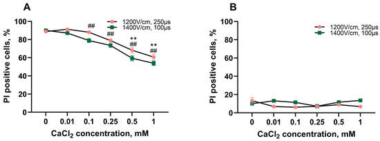 The dependence of PI electrotransfer efficiency on the strength of the applied electric field at different CaCl2 concentrations either before (A) or after (B) electroporation. Cells were treated using one square pulse of 1200 V/cm for 250 μs or 1400 V/cm for 100 μs. Error bars represent the standard error of the mean (SEM) of n = 9 experimental replicates. In case standard errors were lower than actual data points, error bars are not visible. The statistical significance between the control (0 mM) and the 0.1, 0.01, 0.25, 0.5, and 1 mM CaCl2 concentrations are denoted by ** (1200 V/cm) and ## (1400 V/cm). ** and ## represents the p < 0.01.