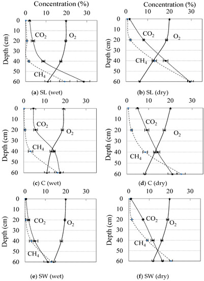 Gas concentration profiles observed in sandy loam (SL), compost (C), and stabilized waste (SW) media during wet and dry periods.