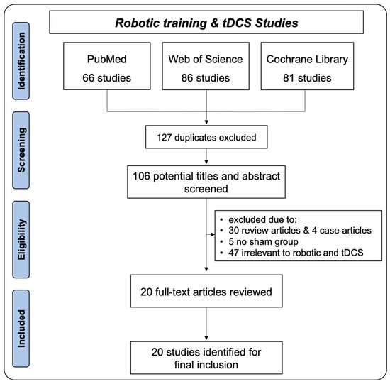 Primary sources and peer-reviewed articles that examined the effects of tDCS combined with robotic training on either upper or lower motor functions in patients with stroke were eligible for inclusion in this systematic review and meta-analysis. Qualifying studies were selected according to the PICO criteria [48] shown in Table 1.