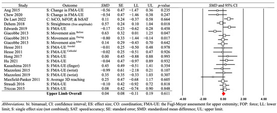Fifteen out of the twenty qualified studies reported primary outcome measures on motor function recovery of the upper limbs. Specific details on the primary upper limb motor function outcome measures from each study were evaluated by: (a) Fugl-Meyer assessment on upper extremity (FMA-UE): 12 studies; (b) straightness during a reaching task: one study; (c) movement aiming task: one study; and (d) average performance during a 3D reaching task: one study.