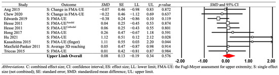 The second moderator variable analysis revealed no significant short-term effects across different post-stroke recovery phases: (a) 4 subacute comparisons from 3 studies (SMD = −0.011; SE = 0.174; variance = 0.030; 95% CI = −0.351–0.330; Z = −0.061; p = 0.951); (b) 14 chronic comparisons from 10 studies (SMD = 0.055; SE = 0.108; variance = 0.012; 95% CI = −0.156–0.266; Z = 0.511; p = 0.609); and (c) 2 subacute and chronic comparisons from 2 studies (SMD = −0.008; SE = 0.295; variance = 0.087; 95% CI = −0.587–0.571; Z = −0.028; p = 0.978). These analyses failed to identify transient motor effects after the augmented combined protocols regardless of the post-stroke recovery phase.