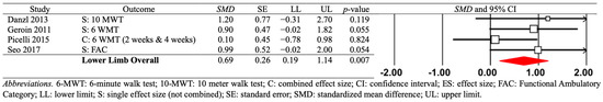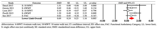 The first moderator variable analysis showed significant short-term effects for RCT studies: (a) four RCT comparisons from four studies (SMD = 0.910; SE = 0.255; variance = 0.065; 95% CI = 0.411–1.409; Z = 3.574; p < 0.001) and (b) one non-RCT comparison from one study (SMD = 0.100; SE = 0.393; Variance = 0.155; 95% CI = −0.671–0.872; Z = 0.255; p = 0.798). These RCT findings indicate that significant positive transient effects were found after the combined protocols on the lower limbs post-stroke.