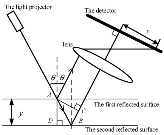 As shown in Figure 1, the basic measuring principle of triangulation is formed by a light projector, an imaging lens and a detector. A linear light stripe beam is projected onto the measured surface at a certain angle, and the detector collects the reflected light from different positions, shown as plane and plane . The deviation of the different positions on the detector is calculated and the height difference between plane and can be deduced. For the height measurement of the micro-bump on the wafer, the height difference between the top of the bump and the wafer surface is calculated using the triangulation method.