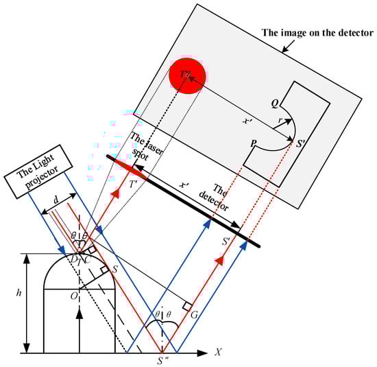 However, in practical situation, the beam width cannot be ignored, and it cannot be projected onto the top of the bump with its light bar center coinciding with the highest point of the bump exactly, as is shown in Figure 4. Affected by the width of the beam from the light projector, the beam reflected from the surface of the wafer forms a long strip on the detector. As part of the light is blocked by the bump, the shadow of the bump forms a concave arc in the long strip. As long as the direction of the light is invariable, the distance from the point , which is located on the top of the bump, to the line tangent to the sphere and parallel to the projected line, is constant. Due to the symmetry of the light path, the distance from the point , formed by the reflected light ray from the very top of the bump, and the point , formed by the reflected light ray corresponding to the incident light ray tangent to the sphere of the bump, is constant on the image plane too. When the light projector moves along the axis, the distance between the two points remains invariant. So, a mathematical model of bump height measurement which is insusceptible to the position and width of light strip is proposed, according to the geometrical relationship mentioned above. The bump height of the bump can be stated in Equation (2).