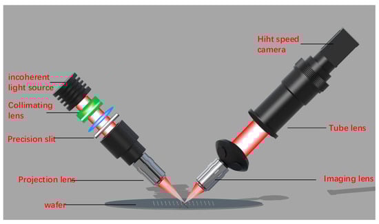In our illumination model, a high-power metal arc lamp is used as the light source, which not only ensures the high illumination intensity required due to the reduction of exposure time during the fast scanning process, but also improves the measurement accuracy, as its incoherent property can effectively minimize the speckle effect caused by traditional coherent light sources. The light beam passing through the optical fiber is truncated by a precision slit aperture, which is manufactured by etching on thin glass coated with an opaque coating; a light stripe with the same shape of the slit aperture is formed. Strict quality requirements for the width and edges of the slit ensure the quality of light stripe. As shown in Figure 5, a slit aperture with a length of 30 mm and a width of 0.05 is installed with optic fiber. Subsequently, a set of optical filters are used to cut off the infrared ray to protect the wafer surface coating from the infrared light. Finally, passing through a group of lenses consisting of a collimating lens and a flat apochromatic microscope objective, an optimal light stripe is formed, and a narrow powerful line with a length of 2 mm and width of 0.025 mm is focused on the measured wafer surface.