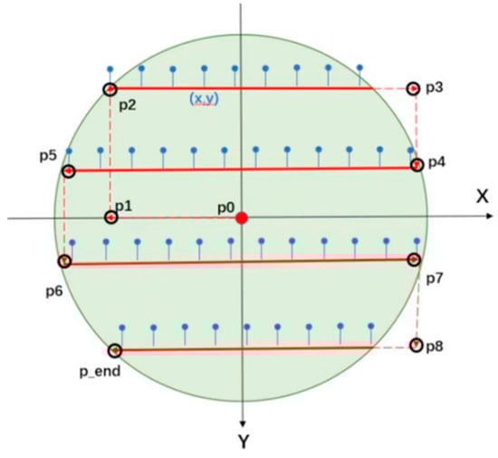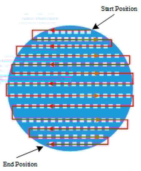 To achieve the full field bump height measurement of the whole wafer, a scanning path generating algorithm was researched based on the field of view and wafer size. As shown in Figure 6. The parameter represents the scanning step. The row numbers of the scanning path are determined by the diameter of the wafer D and scanning step :
