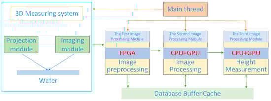 To process the huge amount of data in the detected images, a parallel computing model based on the computing platform composed of FPGA, GPU and CPU is used to achieve scanning of the whole wafer. As shown in Figure 8, the image data acquired from the imaging module are first processed in the first image-processing module, composed of FPGAs in real time, in which image pre-processing algorithms such as image filtering and image segmentation are completed. Then, the image data are simplified and compressed in the second processing module, in which the analysis and statistics of the light stripe data and a rough estimate of the bump height are finished through exploiting the high-parallel capacity of the CPU+ GPU platform. The simplified data are further analyzed in the third module, and the height of the bump is accurately calculated according to the calibrated parameters. In the experiment, 100% 3D scanning of a 200 mm wafer containing approximately three million bumps can be accomplished in 30 min, which represents a throughput of nearly two wafers per hour.
