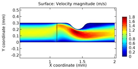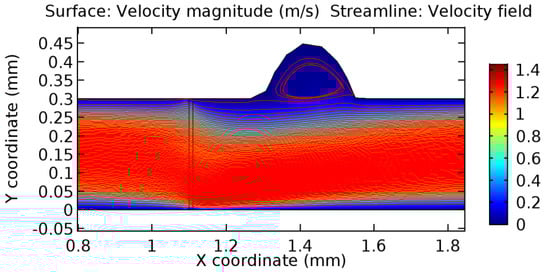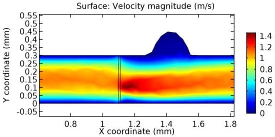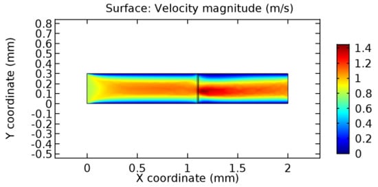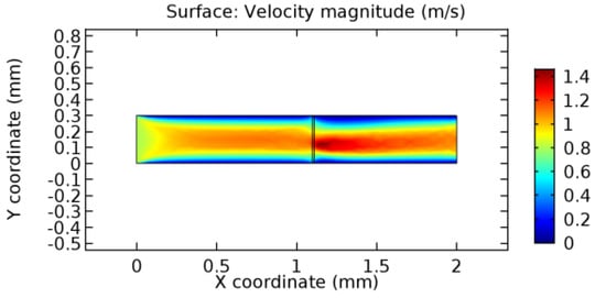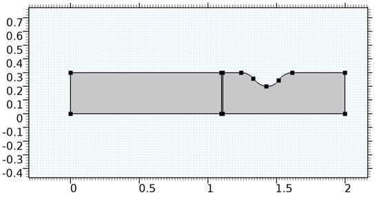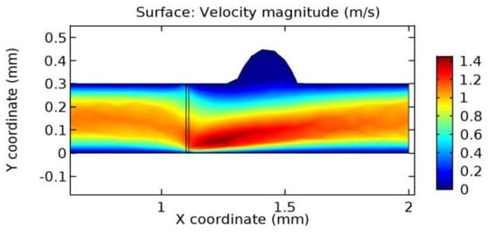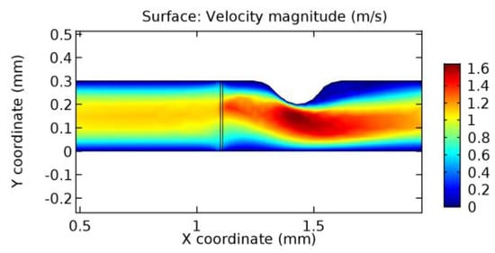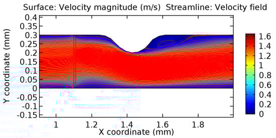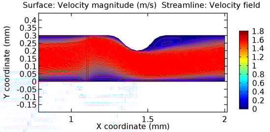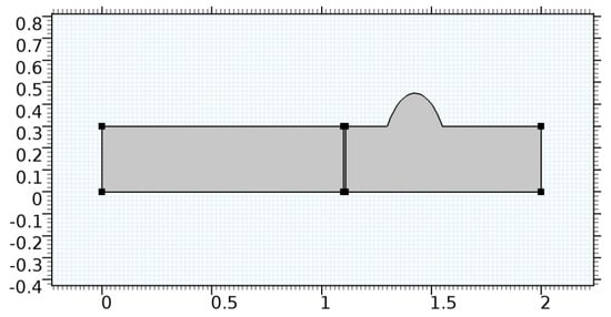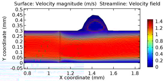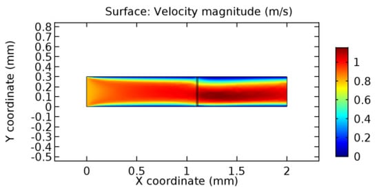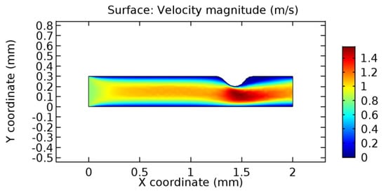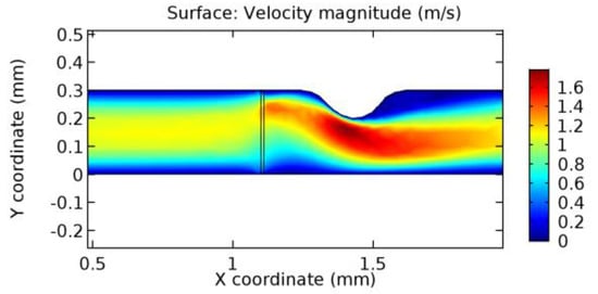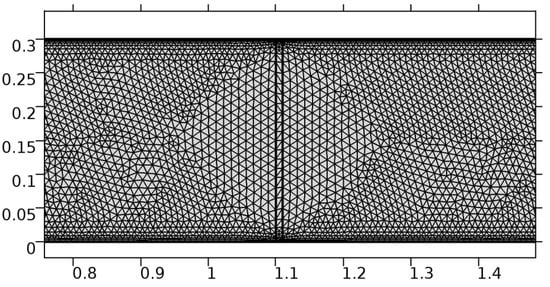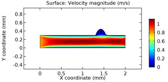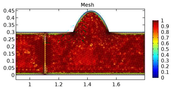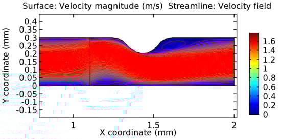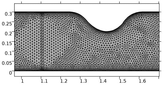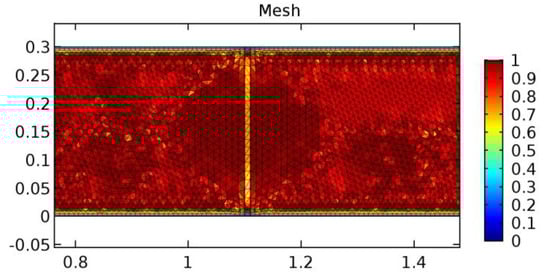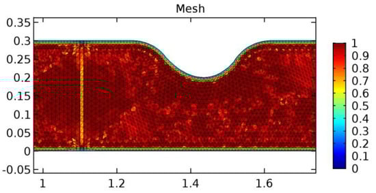 A careful search for a suitable physical configuration has been made after the formulation of the problem statement. An arteriole is chosen as an ideal geometrical object as arterioles are smaller than the arteries and these vessels also undergo pathological changes such as atherosclerosis and aneurysm. In addition, the study and modeling of arteriole stenosis and aneurysm have not been studied by any researcher previously. An arteriole is a blood vessel of smaller dimensions likely to experience the microcirculation that extends and spreads out from an artery connecting to it. The microcirculation is directed to capillaries. The network of blood vessels is seen in Figure 1. A segment of an arteriole of length and diameter of is selected for the present investigation, as seen in Figure 2. Into the flow field of the arteriole segment, a thin film of graphene is introduced. The layer of graphene is considered with a length of and a width of is plugged into the arteriole flow path. The permeability of the graphene layer is maintained at . A fine mesh is generated on the geometry as a consequence of the mesh independence test. Figure 3 depicts the fine mesh generated over the geometry of interest. The quality of the mesh generated can be seen in Figure 4 and Figure 5. The deposition of lipids along the arteriole wall results in the narrowing of the vessel causing the medical condition of atherosclerosis. The stenosed version of the arteriole segment is shown in Figure 6. The meshed version of the stenosed arteriole segment is seen in Figure 7 and the quality of meshing is presented in Figure 8 and Figure 9. Figure 7 encloses the mesh elements of different shapes generated over the geometry constructed. The flow domain is covered with triangular shapes whereas the walls are defined using quadrilateral mesh elements. A neat triangular pattern developed from the graphene layer on either side of the layer can be seen in this figure. The features of a mesh make it possible to run a numerical PDE simulation accurately, efficiently, and faithfully to the physics involved. Figure 8 illustrates this aspect of the meshing produced. In the quality measure of choice, one stands for an element with complete regularity whereas zero stands for an element that has deteriorated. The stress exerted by the flowing blood on the vessel wall can result in the protrusion of the arteriole wall leading to a medical condition of an aneurysm. The aneurysmic arteriole geometry, the mesh generated, and the quality of meshing can be seen in Figure 10, Figure 11, Figure 12 and Figure 13, respectively. The fine mesh details are entailed in Table 1. The FEM solver is set to use the PARDISO solver to solve the system of linear equations due to its high-performing advantages []. The preordering algorithm used is a nested dissection multithread method and relative tolerance of 0.001 is applied to assure the convergence of the solution.
