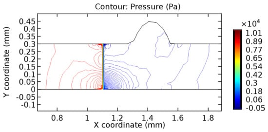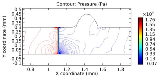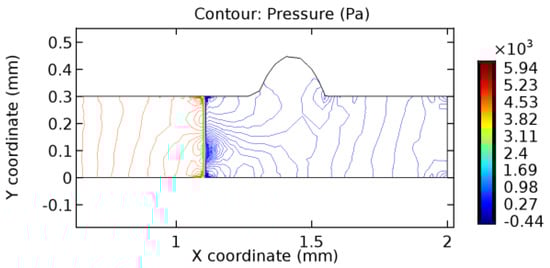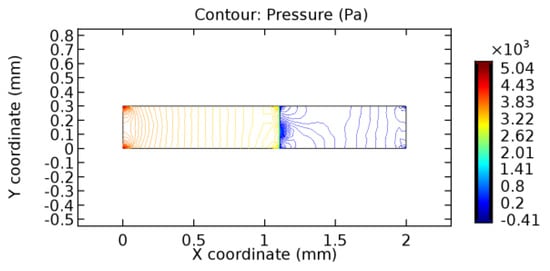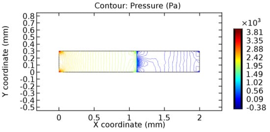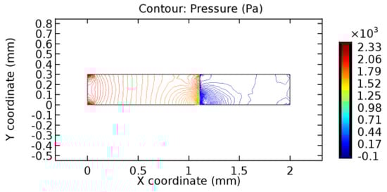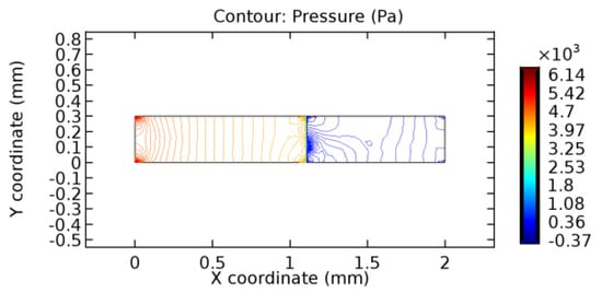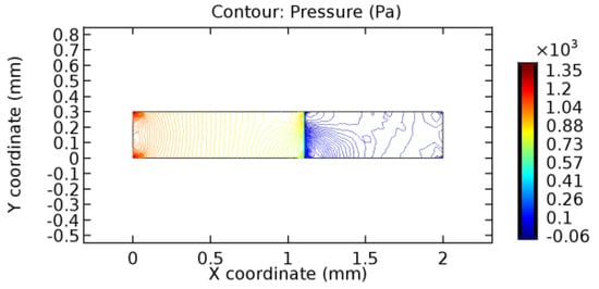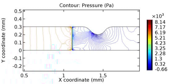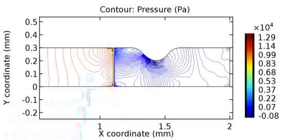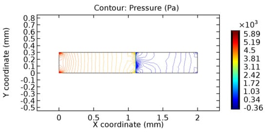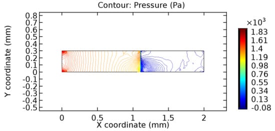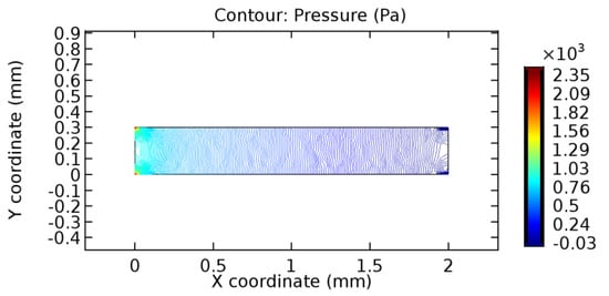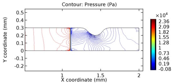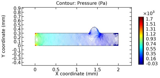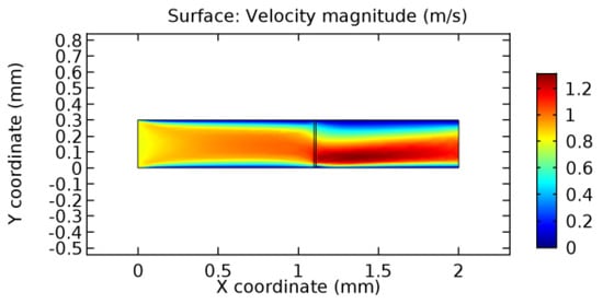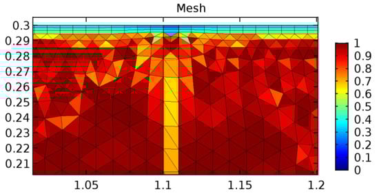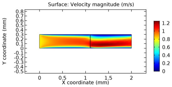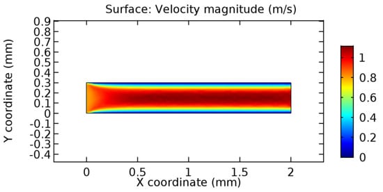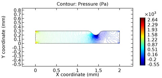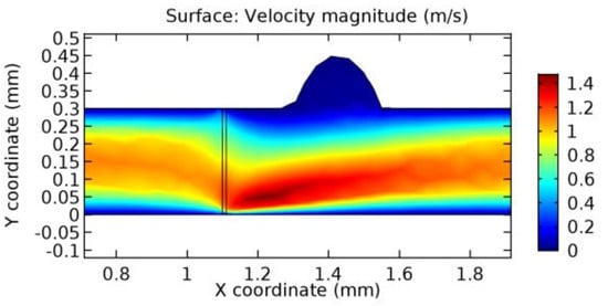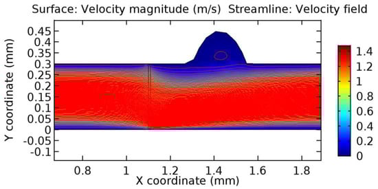 A careful search for a suitable physical configuration has been made after the formulation of the problem statement. An arteriole is chosen as an ideal geometrical object as arterioles are smaller than the arteries and these vessels also undergo pathological changes such as atherosclerosis and aneurysm. In addition, the study and modeling of arteriole stenosis and aneurysm have not been studied by any researcher previously. An arteriole is a blood vessel of smaller dimensions likely to experience the microcirculation that extends and spreads out from an artery connecting to it. The microcirculation is directed to capillaries. The network of blood vessels is seen in Figure 1. A segment of an arteriole of length and diameter of is selected for the present investigation, as seen in Figure 2. Into the flow field of the arteriole segment, a thin film of graphene is introduced. The layer of graphene is considered with a length of and a width of is plugged into the arteriole flow path. The permeability of the graphene layer is maintained at . A fine mesh is generated on the geometry as a consequence of the mesh independence test. Figure 3 depicts the fine mesh generated over the geometry of interest. The quality of the mesh generated can be seen in Figure 4 and Figure 5. The deposition of lipids along the arteriole wall results in the narrowing of the vessel causing the medical condition of atherosclerosis. The stenosed version of the arteriole segment is shown in Figure 6. The meshed version of the stenosed arteriole segment is seen in Figure 7 and the quality of meshing is presented in Figure 8 and Figure 9. Figure 7 encloses the mesh elements of different shapes generated over the geometry constructed. The flow domain is covered with triangular shapes whereas the walls are defined using quadrilateral mesh elements. A neat triangular pattern developed from the graphene layer on either side of the layer can be seen in this figure. The features of a mesh make it possible to run a numerical PDE simulation accurately, efficiently, and faithfully to the physics involved. Figure 8 illustrates this aspect of the meshing produced. In the quality measure of choice, one stands for an element with complete regularity whereas zero stands for an element that has deteriorated. The stress exerted by the flowing blood on the vessel wall can result in the protrusion of the arteriole wall leading to a medical condition of an aneurysm. The aneurysmic arteriole geometry, the mesh generated, and the quality of meshing can be seen in Figure 10, Figure 11, Figure 12 and Figure 13, respectively. The fine mesh details are entailed in Table 1. The FEM solver is set to use the PARDISO solver to solve the system of linear equations due to its high-performing advantages []. The preordering algorithm used is a nested dissection multithread method and relative tolerance of 0.001 is applied to assure the convergence of the solution.