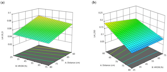 Regarding LAI (Figure 9), considerations quite similar to Height can be made, as the best condition to enhance this property during all the growth phases are driven by restrained Distance (equal to 60 cm) and ratio HR:DB (equal to 25%). In contrast to Height, LAI is not dependent on the presence of White LEDs and the ratio HR:DB plays a role only until 25 days of observation (Figure 9a,b), since after this time each combination of HR:DB tested was equivalent to another as shown in Figure 9c