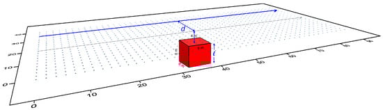Simulation of a 3D ERT survey on a model of a cube-shaped resistive block ( m) buried in a background rock (100 m). The blue points indicate the electrode positions. The size l of the cube is equal to 8 m. The depth of the top of the cube is 4 m. The thick blue line indicates the considered 2D-ERT survey, carried out at an orthogonal distance d from the projection on the surface of the cube’s center.