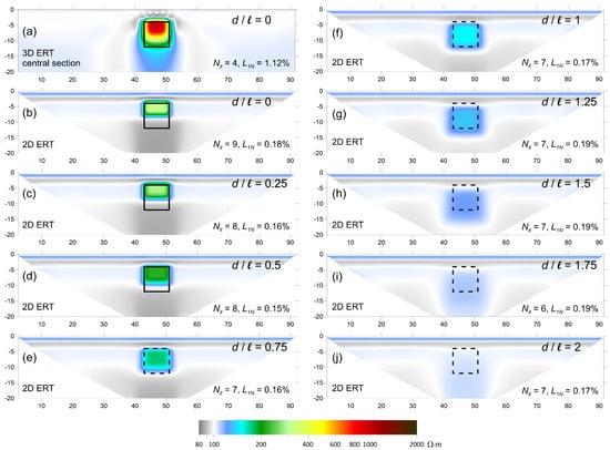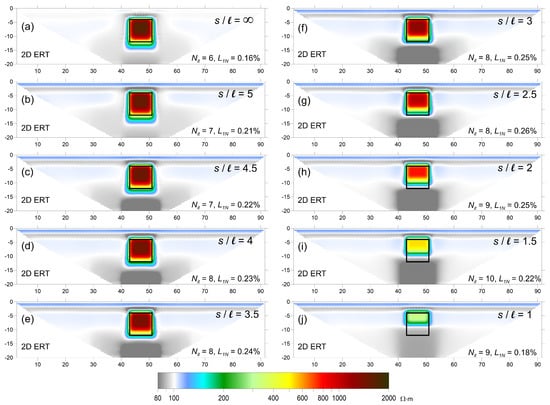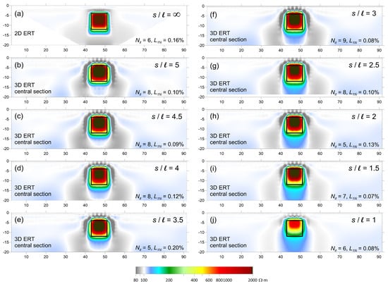 2D ERT inverse models obtained starting from the 3D models of prism-shaped resistive blocks, with different values for the orthogonal width s of the prism, where (a) (2D model) and (b–j) from to (cube model). The orthogonal distance d between the electrode line and the projection on the surface of the center of the cube was equal to zero for all the inversions. The solid black line indicates the boundaries of the prism.