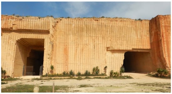 A field test was performed on a calcarenite quarry located inside the “Parco delle Cave” (Park of the Quarries) near the city of Marsala in Sicily (Figure 9). From the time of the Phoenicians until today, this area has been exploited for the extraction of Marsala Calcarenite (Middle-Inf. Pleistocene). This calcarenite is light yellow, homogeneous, well cemented, scarcely fossiliferous and present in very thick banks with calcareous granules and carbonate cement. The rock is vacuolar, highly porous and poorly fractured. The Foderà quarry (Figure 9) is currently used for tourist and cultural activities. The quarries in this area are mainly open-cast quarries, with almost regular shapes and sub-vertical excavation fronts. Most of these quarries were filled, albeit partially, with waste materials from excavation fronts of the same quarry or nearby. In the park, there are also several underground cavities, located at different depths concerning the ground level, made by excavating tunnels supported by pillars [53].