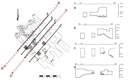 Section C−C’ (Figure 14a) had a very complex shape. It intersected the main tunnels H, J, K and L but also the connecting tunnel R and a small room P connected to gallery N. Furthermore, the section passed close to gallery S, which connected H with J.