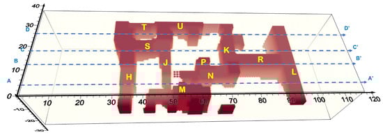 Finally, section D−D’ intersected the main tunnels H, J, K and L and gallery S connecting H to J. It was also close to gallery T, connecting H with J, and gallery U, connecting J with K (Figure 15a).