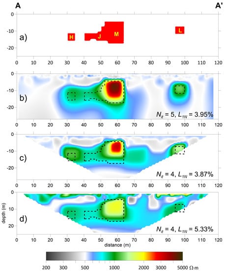 In the case in which the subsoil structures can be represented by homogeneous zones separated by sharp boundaries, an -norm criterion can be used to produce “blocky” models [45,46]. The optimization equation in Equation (5) is modified to