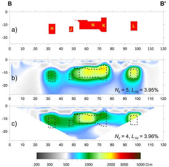Section A−A’ (Figure 12a) intersects tunnels H, J and L and the large chamber M partially filled with waste material. Furthermore, tunnel N is present in the vicinity of the survey line (Figure 11). Overall, the section of the inverse 3D model (Figure 12b) obtained starting from the simulated data was faithful enough to the original geoelectric model. In fact, the large chamber M was highlighted well in terms of its shape, as the two tunnels H and L were highlighted by two smoother anomalies with lower resistivity values, while tunnel J was incorporated into chamber M.