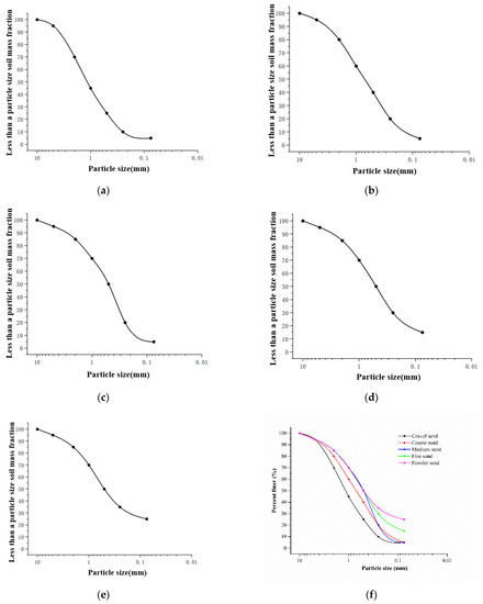 The particle gradation of different grain-size sand soil; (a) gravel sand; (b) coarse sand; (c) medium sand; (d) fine sand; (e) powder sand; and (f) comparison of five grain-size sand.