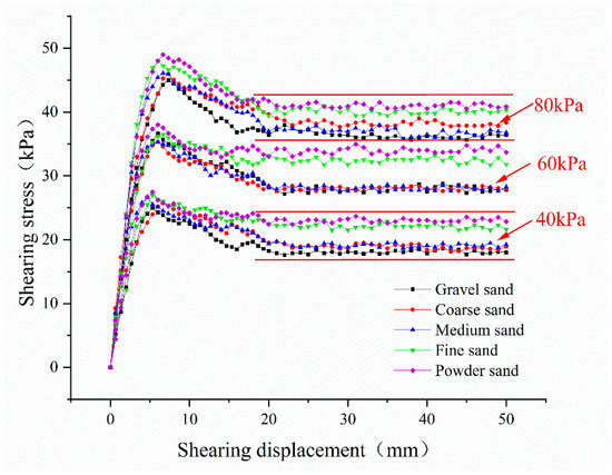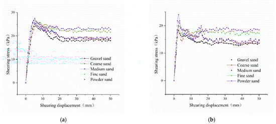 It can be seen from Figure 3 that the variation of the shear stress-displacement curve of sandy soil, with and without slurry lubrication, is basically the same at a normal stress of 40 kPa. In the initial stage of shear, with the increase of shear displacement, the shear stress increases, and there is an obvious peak value of the curve. After reaching the peak, the shear stress will decrease with the increase of the shear displacement and then gradually stabilize, showing an obvious strain-softening type. Figure 3a shows that without slurry lubrication, the peak and stable values of the shear stress are related to the grade of the soil sample, which shows that powder sand > fine sand > medium sand > coarse sand > gravel sand, that is, the peak and stable values of the shear stress decrease with the increase of the sand soil particles. Figure 3b shows that the order of peak shear stress and the stable value in the slurry-lubricated test group is the same as that without slurry lubrication, but the value is smaller than that without slurry lubrication. The following test results can be obtained by comparing the test groups with reference to different normal stress conditions: the larger the sand particles are, the smaller the shear stress between the steel plate and the sand, when other conditions are the same. Sitharam et al. [17] in 2000 showed that the internal friction angle of sandy soil is positively related to its average grain size, and as the grain size of sandy soil increases, the internal friction angle of sandy soil increases, and the shear stress between sandy soil and a steel plate increases. The above experimental phenomenon is just the opposite of Sitharam, which is analyzed as follows. There are differences in the mechanical parameters between the contact surface of sandy soil and a steel plate with different grain sizes, which are related to the sandy soil grain size and grain gradation. The sandy soil configured in the test is divided into five types according to the average particle size. The sandy soil particles are all irregularly shaped with sharp angles, and the sandy soil with a large average particle size has a high content of large particles. The contact mode between large particles is mostly point contact, the pores between particles are large and the effective contact area is relatively small, so the effective contact area between the same steel plate is small. The sand with a small average particle size has a high content of small particles, a good filling effect between particles and a denser structure, so the effective contact area with the steel plate is also larger. Therefore, the peak shear stress between the sand with a small average particle size and the steel plate is larger under the same condition of normal stress.