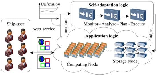 The ship supplying information system (SUIS) [15] is a web service-based system, responsible for handling supplying requirements submitted by ship-users, and it can automatically calculate and dispatch food, water, oil, and other supplying materials to ships. However, this web service-based system suffers the problem of Slashdot effect [16]: during the sailing task-intensive period, the supplying requirements increase rapidly, and the servers respond slowly or even crash; while during the rest period, there are rarely supplying requirements and most servers are freed. In order to improve the quality of the services and to decrease operating costs, SUIS was reconstructed based on the cloud computing architecture. By being redeployed with the MAPE-K [6,17] architecture, SUIS was composed of two parts, i.e., the self-adaptation logic and the application logic, as shown in Figure 1. The former is responsible for monitoring and optimizing service performance by dynamically adjusting the servers in operation, while the latter is used to provide continuous and reliable web services to ship-users.