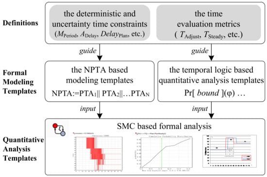 The time behaviors of the SAS systems are difficult to describe and analyze quantitatively, as they run in the uncertainty environment. To this end, this paper created an approach called Timed-SAS following three steps, defining the time constraints and time evaluation metrics, constructing the NPTA based formal modeling templates, and creating a set of SMC-based quantitative analysis templates, as shown in Figure 2.