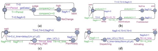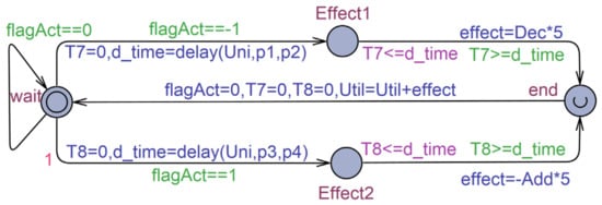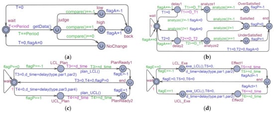 Similarly, the template for Execute process and the uncertainty delay time DelayExecute is shown in Figure 8d. This process is triggered by flagE, and the executing processes are implemented with two functions of exe_LCL( ) and exe_UCL( ), which need further customization in the back-end configuration.