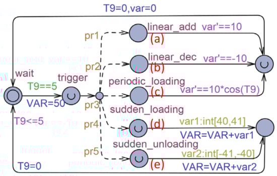 In order to simulate the dynamic software running environment, we created a template called Uncertainty Environment1, as shown in Figure 9. This modeling template describe two kinds of uncertainty, i.e., the stochastic software behaviors and the dynamic system loads. The former is handled with the probabilistic choices between multiple enabled transitions. As shown in Figure 9, there are five transitions following the state of “trigger”, and the transitions are executed with different probabilities, i.e., pr1, pr2, pr3, pr4, and pr5. While the latter is simulated with different kinds of functions. For example, transition (a) and (b), respectively, represent the linearly increasing and linearly decreasing monitored-variables; transition (d) and (e) respectively describe the sudden increase and decrease monitored variables; while transition (c) represents the periodical changing monitored variables.