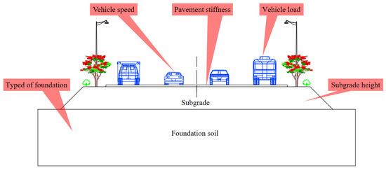 The disturbance depth of a traffic load is mainly related to the subgrade height, pavement stiffness (different pavement stiffnesses are represented by changing the elastic modulus of the pavement materials), foundation type (different types of foundations are represented by changing the unit weight of the foundation rock and soil), vehicle load, and vehicle speed [23], as presented in Figure 1. Different subgrade heights, pavement stiffness values, vehicle speeds, vehicle loads, and typed of foundations will affect the disturbance depth of a traffic load. To quantitatively calculate the relationship between the traffic load disturbance depth and the abovementioned factors, Midas GTS was used to calculate the traffic load disturbance depth under different influencing factors, and a multiple regression was used to fit the calculation formula of the traffic load disturbance depth.