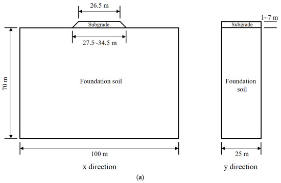 Numerical simulation. Midas GTS software was used to establish the calculation model of traffic load disturbance depth. The schematic diagram of the model is presented in Figure 2. The x direction of the model is the cross-section direction of the road, and the y direction is the longitudinal-section direction of the road, where the length × width × height of the model under the road = 100 m × 25 m × 70 m, and the width of the bottom of the subgrade is 27.5~34.5 m, according to the subgrade height of 1~7 m; that is, a slope ratio of the subgrade slope of 1:1. During the grid division, smaller grid sizes were adopted for the subgrade, surface layer, base layer, and foundation, and the model as a whole was distributed from the subgrade to the surrounding boundary from dense to sparse.