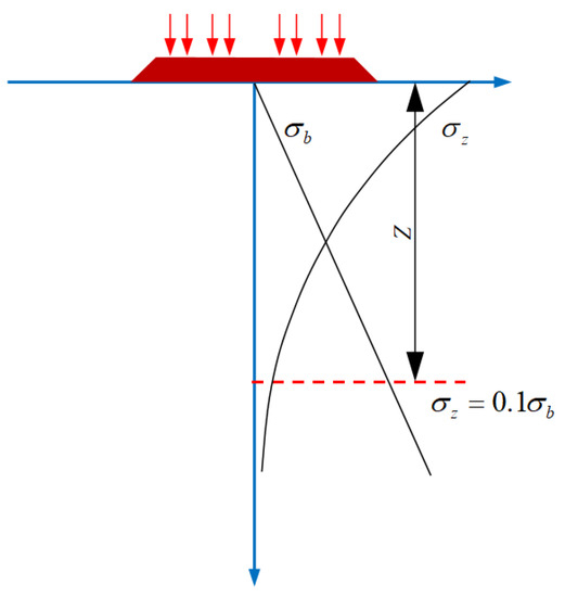 Discriminant conditions. Disturbance depth is related to the foundation type and load size. Combined with domestic and foreign research results and engineering experience, it can be determined that when the additional stress, of a traffic load in the foundation is lower than 10% of the self-weight stress, of soil (presented in Figure 3), it is considered that the additional stress will no longer affect the deformation of soil at this depth and below [28], and depth Z can be taken as the disturbance depth of the traffic load.