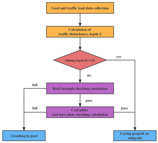In the process presented in Figure 6, geophysical prospecting, drilling, laboratory tests, and data collection should first be used to determine the following factors: (1) the depth of the goaf area, the distance between the pillars, and the width and height of the coal pillars; (2) the thickness and tensile strength of the roof of each rock and soil layer in the goaf; and (3) the subgrade height, pavement stiffness, vehicle speed, and maximum vehicle load of the goaf area. After the information mentioned above was successfully determined, the disturbance depth of the traffic load in the road section was calculated using the formula (1). If the mining depth was 1.5 times greater than the disturbance depth [31], it could be determined that the subgrade can be treated by laying a geogrid. If the mining depth was 1.5 times less than the disturbance depth, checking calculations for the roof, coal pillar, and base plate are required. When the checking calculation of the traffic load disturbance depth is not thorough enough, the tensile stress and safety factor values of the roof are calculated according to Formulas (2) and (3), respectively. If the safety factor is greater than 1.5, the stability values of the coal pillar and base plate need to be checked; if it is less than 1.5 [22], grouting treatment can be determined. After the roof check has been passed, the average vertical stress and strength of the coal pillar can be calculated according to formulas (4) and (5), respectively, and then the safety factors of the coal pillar and base plate can be calculated according to formulas (6) and (7), respectively. If both present values greater than 1.5, it can be determined that the subgrade will be treated by laying a geogrid; otherwise, grouting treatment is required.