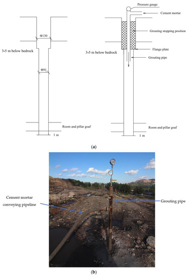 Grouting treatment. (a) Schematic diagram of grouting (the size of the grouting hole on the left side and the flow direction of slurry on the right side); (b) grouting on site.