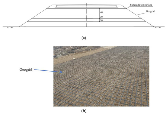 Geogrid treatment. (a) Schematic diagram of geogrid position; (b) laying geogrid on site.