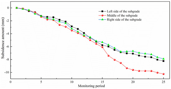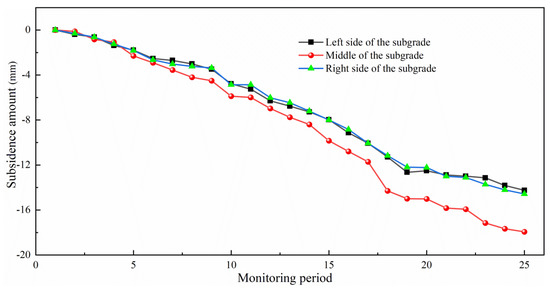 As can be observed in Figure 10, following one year of grouting treatment for K1631 + 985~K1632 + 100, the subsidence trend in the middle and both sides of the subgrade gradually tended to become smooth over time, which is in line with the subsidence trend of the normal subgrade. The values of the middle and both sides of the subgrade were −17.94, −14.25, and −14.57 mm, respectively, which met the subsidence requirements of the subgrade following construction. It can be observed in Figure 11 that the subsidence trend of K1627 + 145~K1627 + 423, at the middle and both sides of the subgrade, gradually tended to become smooth over time after laying the geogrid for one year, which agrees with the subsidence trend of the normal subgrade. The subsidence values of the middle and both sides of the subgrade were −10.25, −8.24, and −7.91 mm, respectively, which met the subsidence requirements of the subgrade following construction.