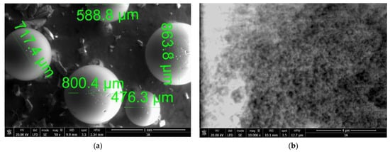 In Figure 1a, it is seen that the beads exhibit as a perfect ball, with the diameter varying from 476 µm to 864 µm. In addition, in Figure 1b, it is seen that the sample has a rough surface and uniform distribution of pores.