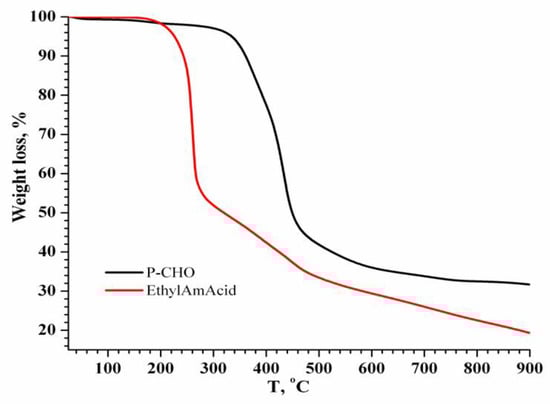 The comparative interpretation of the TG spectra (Figure 3) for the synthesized sample (EthylAmAcid) and aldehyde support shows that after 900 °C, the decomposition of EthylAmAcid sample gives 19.3% residue; that after 900 °C, the aldehyde support shows better stability, and at decomposition it gives 34% residue; and that the EthylAmAcid sample has stability up to a temperature of 260 °C compared to aldehyde support, which is stable up to a temperature of 420 °C.