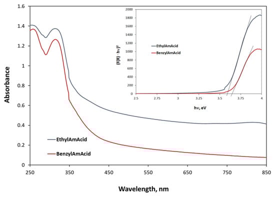 The UV-VIS spectra for the samples are presented in Figure 4. The spectra present a broad absorption band in the UV domain, with two shoulders at 260 and 320 nm, that originate from the intra-aromatic π–π* transitions in copolymer [21]. The direct allowed band gap energies, calculated from the Kubelka–Munk transformed diffuse reflectance spectra, are 3.60 eV for EthylAmAcid sample and 3.65 eV for BenzylAmAcid sample. The values of band gap energies are in the domain of the energies calculated for other polymers [22,23]. The type of the groups, [(diethyl)(phosphono)methylene]glycine pendant groups or [(dibenzyl)(phosphono)methylene]glycine pendant groups, grafted on copolymer does not lead to obtaining very different values for the band gap energy. The small variation band gap energy for these structures may be due to the subtle difference in their structural arrangement. It is expected that the behavior of the samples will be similar in the process of heterogeneous photocatalysis.