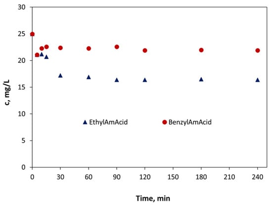 The adsorption efficiency developed by the two materials is: 34.4% for EthylAmAcid and 12.5% for BenzylAmAcid. Under these experimental conditions, the equilibrium adsorption capacities reached the values of 8.62 mg/g for EthylAmAcid and 1.95 mg/g for BenzylAmAcid, respectively.