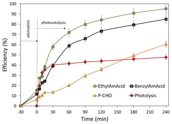 A comparison between the photocatalysis efficiency developed by the materials EthylAmAcid, BenzylAmAcid and P-CHO is presented in Figure 6. Starting from the initial concentration of 50 mg/L CR, the photolysis efficiency was 47.7% after 240 min of irradiation. Aldehyde support (sample P-CHO) has poor photocatalyst characteristics; after 240 min of reaction, a CR removal efficiency of 60.5% was achieved. However, samples EthylAmAcid and BenzylAmAcid have developed verry good efficiencies, of 95.3% and 85.1%, respectively. It can be concluded that by grafting the aldehyde support with the [(diethyl)(phosphono)methylene] glycine pendant groups/[(dibenzyl)(phosphono)methylene]glycine pendant groups, the photocatalyst characteristics of the synthesized materials are improved. The two studied materials (EthylAmAcid and BenzylAmAcid) presented a low adsorption capacity, but in the meantime developed a very good photocatalysis efficiency. These underline their efficiency to be used as catalytic materials in the degradation process of dyes from water using photocataysis treatment.