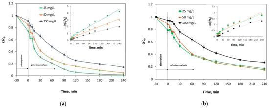 The influence of the initial concentration of the dye is shown in Figure 7. At a lower initial concentration (of 25 mg/L), almost all the dye was removed from the solution after 240 min of heterogeneous photocatalysis, when using material EthylAmAcid as a catalyst (Figure 7a). The efficiency of CR removal was calculated, and it was 98.6%. With an increase in the initial concentration, the efficiency of the photocatalysis process decreases, reaching 86.0% for 100 mg/L CR. When we used material BenzylAmAcid as a photocatalyst, it can be seen from Figure 7b that the lower initial concentrations of CR had a weak influence on the efficiency of the process. The efficiency was 83.1% and 85.1% when starting from the initial concentration of 25 mg/L and 50 mg/L, respectively. For an initial CR concentration of 100 mg/L, and using material BenzylAmAcid as the photocatalyst, a process efficiency of 73.1% was obtained. The efficiency of CR dye removal from the solutions with different initial concentrations and using the two materials as photocatalysts are presented in Table 2.