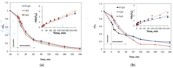 Influence of solid catalyst amount when using EthylAmAcid as the photocatalyst (a); BenzylAmAcid as the photocatalyst. Inset: kinetics of photocatalysis (b). c0 = 50 mg/L. Inset: kinetics of photocatalysis.