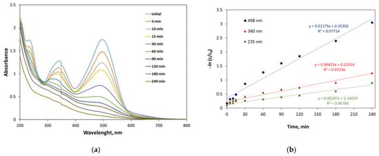 Figure 9a shows the UV-VIS spectra of the 50 mg/L CR solution subjected to photocatalysis with 1 g/L material EthylAmAcid. The CR dye solution has three absorption bands in the UV-VIS spectrum. The absorption band with the maximum at 498 nm is due to the azo bond and the decrease in the intensity of this band corresponds to the break of this bond, so it corresponds to the discoloration of the solution. The other two absorption bands in the UV domain, with maxima at 340 nm and 235 nm, are due to the benzene and naphthalene rings, respectively. The decrease in intensity of these bands is due to the opening of the naphthalene and benzene aromatic rings, with the formation of intermediate products. During the photocatalysis process, the maxima of the absorption bands decrease in intensity, without any shifting taking place since probably the CR oxidation products do not absorb UV-VIS radiation. After 240 min, the spectrum of the CR solution became almost flat, because of the opening of the benzene and naphthalene rings and the breaking of the azo bonds from the dye molecules.