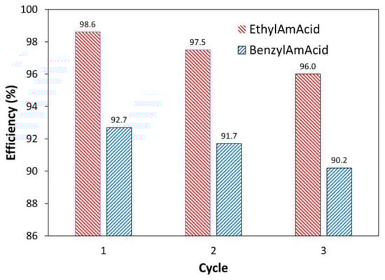 In order to evaluate the possibility of catalyst reuse, three cycles of CR degradation were performed. After each experiment, the catalyst was separated by filtration from the dye solution, washed with distilled water and dried at 105 °C overnight. Figure 10 shows the efficiency of CR degradation by reusing the photocatalysts. The tests were conducted by using the conditions in which the photodegradation efficiency in the first cycle was maximum: 25 mg/L CR solution with 1 g/L EthylAmAcid and 50 mg/L CR solution with 2 g/L BenzylAmAcid. Both catalysts showed good stability when reused, the efficiency of heterogeneous photocatalysis remaining higher than 90% even after three cycles.