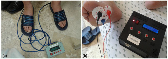This system measures the temperature in four zones of the sole of the foot (Zone 1: hallux toe, Zone 2: first metatarsal, Zone 3: arch and Zone 4: heel), selected because they are some of the most prone to ulceration in patients with diabetes mellitus [15]. These areas have a relationship with the increase in temperature caused by inflammation and tissue degradation [16]. We can divide this system into the templates with four LM35 sensors (accuracy ± 0.2 °C) in the special areas of the foot and the electronic equipment shown in Figure 1a, which is a box with dimensions of 10 × 5 × 3 cm with an electronic board that measures and stores the temperatures obtained from a measurement in an EEPROM memory and erases the stored measurements and/or sends them via USB communication to a computer. In the user interface, one can see the result of different processes, such as data acquisition, processing, and data storage, among others, performed by the electronic circuit of this system. The duration of the measurements is fifteen minutes and the sensors capture data every two seconds to have an average of each minute, so at the end there are fifteen temperatures of each zone per measurement [17]. A thermostatic bath (RCTB 3000, OMEGA Engineering, Inc., Norwalk, CT, USA) and a fractional degree precision mercury thermometer with an accuracy of ±0.1 °C (ThermcoProducts, Lafayette, NJ, USA) were used to characterize this system in terms of temperature [17].