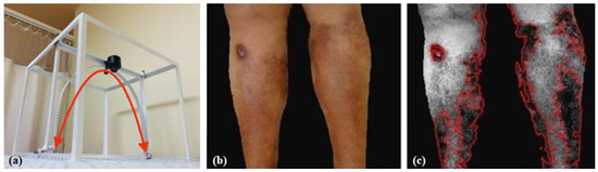 This system was designed to keep track of the changes that occur in the skin of the extremities of diabetic patients. The image is captured by a device called WIAS (Wireless Image System) composed of an 18 MP digital camera (Sony DCS-QX100, New York, NY, USA) and a metal-based positioning frame (see Figure 2a). Then, the maculae are characterized by image processing techniques that find the areas of interest by using a segmentation and characterization algorithm. The system is composed of a graphical user interface (GUI) developed in MATLAB. The images of the maculae are introduced into an artificial neural network classifier, which differentiates them with an accuracy of 97.5%. In Figure 2b, we can see the delimited region for image processing, removing the information that is not necessary, and in Figure 2c, we can see the regions selected by the system and the classification of the macules. These images show the first steps for the study of this system, but we can say that with the correct monitoring of the cutaneous manifestations, it is possible to provide insights into the progression of tissue damage at the feet and provide early treatment and support in the prevention of amputations due to diabetic foot [20].
