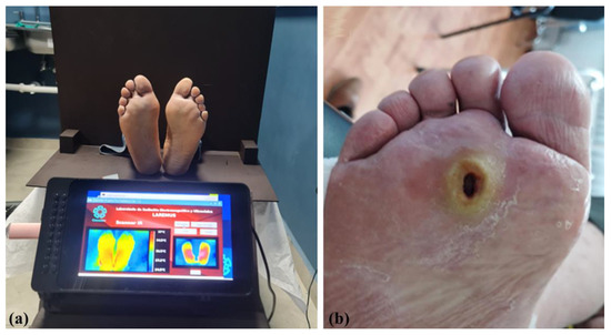 Figure 3. (a) IR Scanner device in a study with a diabetic patient. (b) Photograph of a characteristic diabetic patient’s lesion.