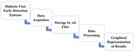 Figure 5. Diagram of the hub of information on diabetic foot. This shows the synchronous process that the systems follow to achieve the results. First, the data acquisition through USB, which operates at a maximum speed of 480 Mbps to each of the systems, then saves the information in .xls format to use it later on. The device reads through the file using Python language; then, the system finds the graphical results [26].